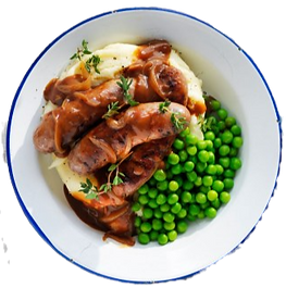 Our Bangers and buttered potatoes are an Irish classic with a Gritz twist. Making our own sausages fresh every day, we top them with a homemade red wine sauce, caramelized onions, and some fresh green peas. This dish is popular for a reason